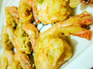 Dip the prawns one by one in the batter and hold it briefly over the bowl to let the excess drip off and then gently drop the prawn into the oil